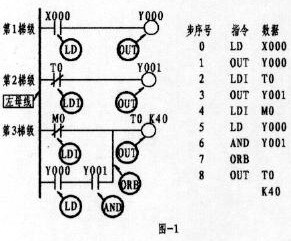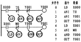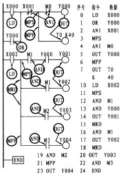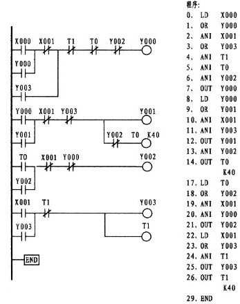 第3梯級;左邊第一個(gè)觸點(diǎn)為常閉,上標(biāo)為M0, M為輔助繼電器(該繼電器有多種,注意類別),其指令的正確表示應(yīng)為:4、LDI  M0(如程序所示)。本梯級的第2行第一個(gè)觸點(diǎn)為常開,上標(biāo)為Y000,Y表示輸出繼電器,由于該觸點(diǎn)與后面Y001觸點(diǎn)呈串聯(lián)關(guān)系,形成了所謂的電路"塊",故而其觸點(diǎn)的指令應(yīng)為 5、LD  Y000。總之LD與LDI指令從上面可以看出,它們均是左母線每一梯級第一觸點(diǎn)所使用的指令。而梯級中的支路(即第3梯級的第2行)有二個(gè)或二個(gè)以上觸點(diǎn)呈串聯(lián)關(guān)系,其第一觸點(diǎn)同樣按LD或LDI指令。可使用LD、LDI指令的元件有:輸入繼電器X、輸出繼電器Y、輔助繼電器M、定時(shí)器T、計(jì)數(shù)器C、狀態(tài)繼電器S。OUT為線圈驅(qū)動(dòng)指令,該指令不能出現(xiàn)在左母線第一位。驅(qū)動(dòng)線圈與驅(qū)動(dòng)線圈不能串聯(lián),但可并聯(lián)。同一驅(qū)動(dòng)線圈只能出現(xiàn)一次,并安排在每一梯級的最后一位。如上圖中的1、OUT  Y000,3、OUT  Y001,Y為輸出繼電器,其線圈一旦接獲輸出信號,可以這樣認(rèn)為,線圈將驅(qū)動(dòng)其相應(yīng)的觸點(diǎn)而接通外部負(fù)載(外部負(fù)載多為接觸器、中間繼電器等)。而上圖8、OUT  T0  K40 為定時(shí)器驅(qū)動(dòng)線圈指令,其中的K為常數(shù)40為設(shè)定值(類似電工對時(shí)間繼電器的整定)。可使用OUT指令元件有:輸出繼電器Y、輔助繼電器M、定時(shí)器T、計(jì)數(shù)器C、狀態(tài)繼電器S。