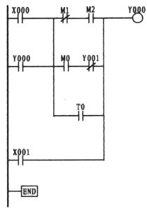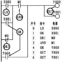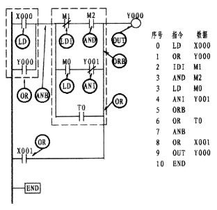 可以看出上圖的X000、X001、M0三者處于并聯(lián)關(guān)系。由于X000下面二條支路均為單個(gè)觸點(diǎn),因X001是常開觸點(diǎn),故用OR指令。而M0是常閉觸點(diǎn),則用ORI指令。三接點(diǎn)并聯(lián)后又與M1串聯(lián),串聯(lián)后又與Y000并聯(lián),而Y000也是單個(gè)觸點(diǎn),所以仍采用OR指令。可使用OR、ORI指令元件有:輸入繼電器X、輸出繼電器Y、輔助繼電器M、定時(shí)器T、計(jì)數(shù)器C、狀態(tài)繼電器S。
