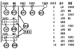 由上圖可以看出,第一支路X003的常開觸點(diǎn)與M1的常開觸點(diǎn)成串聯(lián)關(guān)系(在這樣的情況下,形成了塊的關(guān)系),它是與上一行的X000與M0串聯(lián)后相并聯(lián),此時(shí)程序的編寫,如步序號0、1、2、3、4所示。4所出現(xiàn)的第一個(gè)ORB指的是與上一行并。而第二支路,常閉Y001與M2同樣是串聯(lián)關(guān)系。也是一個(gè)塊結(jié)構(gòu),其串聯(lián)后再與第一支路并。故步序7再次出現(xiàn)ORB。ORB指令并無梯形圖與數(shù)據(jù)的顯示。可以這樣認(rèn)為;它是下一行形成電路塊的情況下與上一行并聯(lián)的一條垂直直線(如圖中所示的二條粗線)。