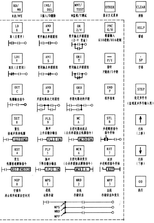 ②輸入指令:如指令 LD   X000 , 按以下順序輸入 LD→X→0→GO 即可,屏上自動(dòng)顯現(xiàn) LD  X000。其它指令類推。對于ORB、ANB、MPS、MRD、MPP、END、NOP等指令,輸入后只要按GO確認(rèn)即可(ORB→GO)。