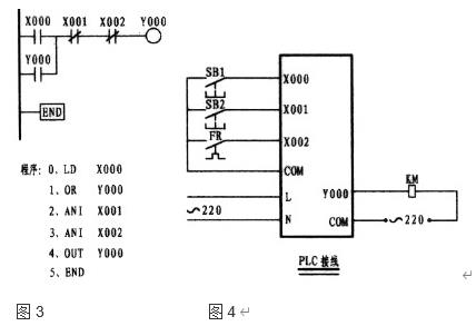 工作原理:以圖3為例說明,當(dāng)外接啟動(dòng)按鈕一按,X000的常開接點(diǎn)立即閉合電流(實(shí)為能流),流經(jīng)X001、X002的常閉接點(diǎn)至使輸出繼電器Y000閉合,由于Y000的閉合,并接于母線側(cè)的Y000常開觸點(diǎn)閉合形成自保,由輸出繼電器接通外部接觸器,從而控制了電動(dòng)機(jī)的運(yùn)行。停止時(shí)按外部停止按鈕,X001常閉接點(diǎn)在瞬間斷流從而關(guān)斷了輸出繼電器線圈,外部接觸器停止運(yùn)轉(zhuǎn)。當(dāng)電動(dòng)機(jī)過載時(shí),外部熱繼電器常閉接點(diǎn)閉合,導(dǎo)至X002常閉接點(diǎn)斷開,從而保護(hù)電動(dòng)機(jī)。