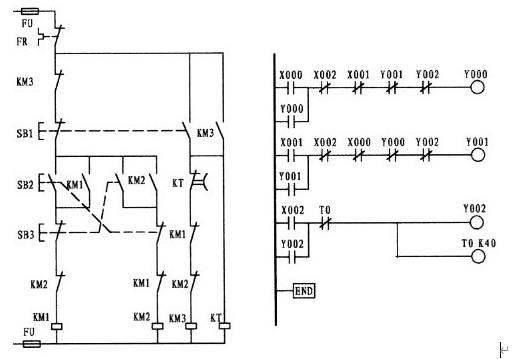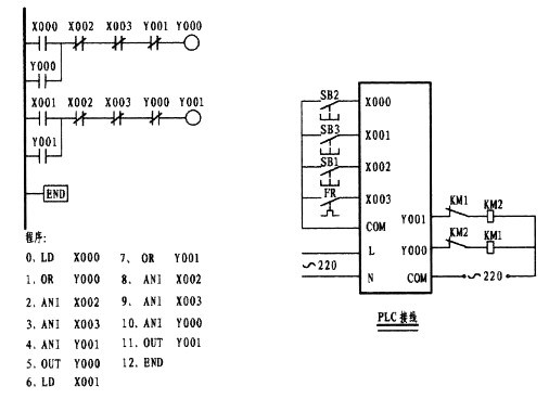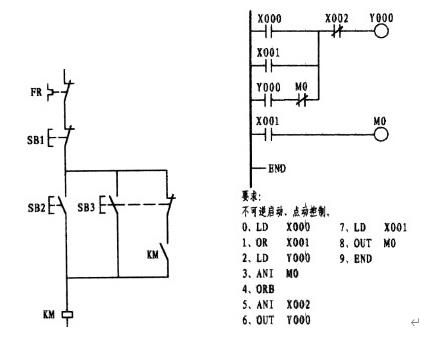 這一道題往往是初學(xué)者邁不過的一道坎。這主要是因?yàn)槔^電器電原理圖使用的是復(fù)合按鈕,形成的思維定式所造成。從梯形圖中可以看出,X001為點(diǎn)動(dòng)控制觸點(diǎn),因左邊的電原理圖是使用的復(fù)合按鈕,思維上自然而然轉(zhuǎn)向了采用X001的常閉觸點(diǎn),與X001的常開形成了與復(fù)合按鈕相似的效果,想象是不錯(cuò)。要知道PLC在運(yùn)行狀態(tài)下,是以掃描的方式按順序逐句掃描處理的,掃描一條執(zhí)行一條,掃描的速度是極快的。如果是用X001的常閉代替M0的常閉的話,當(dāng)按下外接點(diǎn)動(dòng)按鈕時(shí),X001常開觸點(diǎn)則閉合而常閉接點(diǎn)則斷開,但一旦松手其常閉觸點(diǎn)幾乎就閉合形成了自保,因此失去了點(diǎn)動(dòng)的功能,變?yōu)橹挥袉?dòng)的功能。梯形圖中的第一梯級中的第二支路是由Y000的常開與中間繼電器M0的常閉相串后再與第一支路相并,在這樣觸點(diǎn)多的情況下如果允許應(yīng)將它擺列在第一行,這樣在編程時(shí)可以少用了ORB指令。