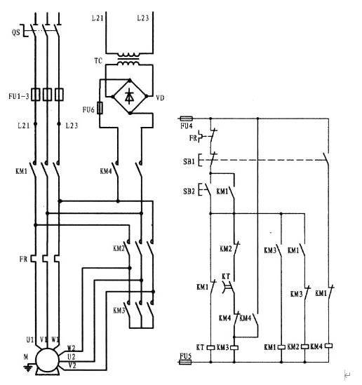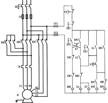 該線路控制的是一臺(tái)雙速電動(dòng)機(jī),一般的人對它不是很理解。電動(dòng)機(jī)型號為YD123M-4/2,6.5/8KW,△/Y。根據(jù)型號解讀;該電機(jī)具有二種速度即4極和2極,在4極速度下,電動(dòng)機(jī)的功率為6.5KW,繞組為三角形接法。如果在2極的速度下,電動(dòng)機(jī)的功率為8KW,繞組為雙星接法。該電動(dòng)機(jī)共有6接線頭,三角形接時(shí)(低速)電源由U1、V1、W1接入,其余接頭U2、V2、W2為懸空。星接時(shí)(高速)將接線頭U1、V1、W1接成星點(diǎn)形成了雙星點(diǎn),三相電源則由U2、V2、W2輸入(電動(dòng)機(jī)接線圖詳上圖所示)。該線路要求;電機(jī)可以在低速、高速狀態(tài)下?lián)衿湟贿\(yùn)行。而在高速運(yùn)行時(shí)則按低速啟動(dòng)再轉(zhuǎn)為高速運(yùn)行。自己可根據(jù)電原理圖進(jìn)行分析。