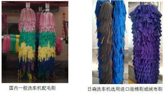 ????日森全自動洗車機在刷子材質上一直選用進口泡棉材質,抗老化能力強,洗10萬輛車還能保證質地柔軟。絨布刷為進口高織棉,洗凈度更高。
