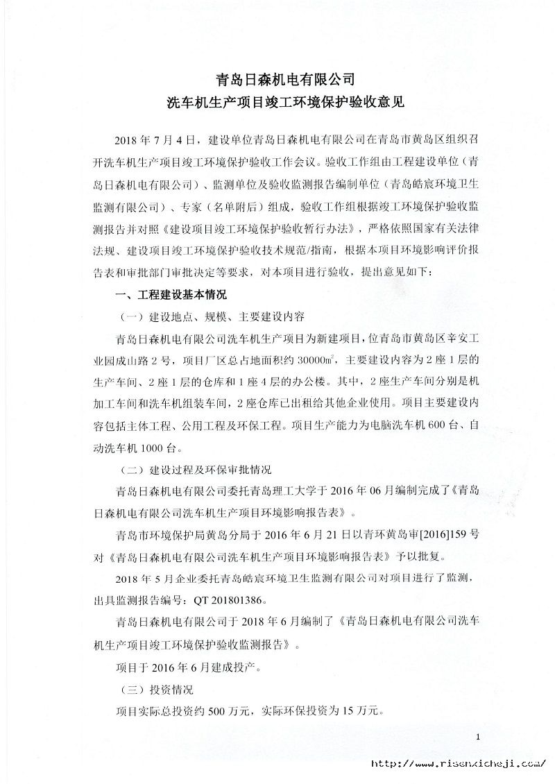 青島日森機電有限公司洗車機生產項目竣工環境保護驗收意見