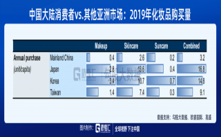 中國化妝品行業(yè)的空間和格局 中國化妝品行業(yè)未來的發(fā)展空間大,增長確定性強。 參考其他亞洲國家的情況可發(fā)現(xiàn),化妝品消費水平和GDP之間存在較強的正相關(guān)關(guān)系。2019年中國化妝品支出/實際GDP為0.3%,而日韓的占比則為0.5~0.6%。 所謂市場發(fā)展?jié)摿Υ螅簿褪翘旎ò甯撸司瘖y品消費水平的上升空間大。歐睿國際數(shù)據(jù)顯示,2019年我國消費者人均購買3件化妝品。對比之下,日韓消費者人均購買15~1